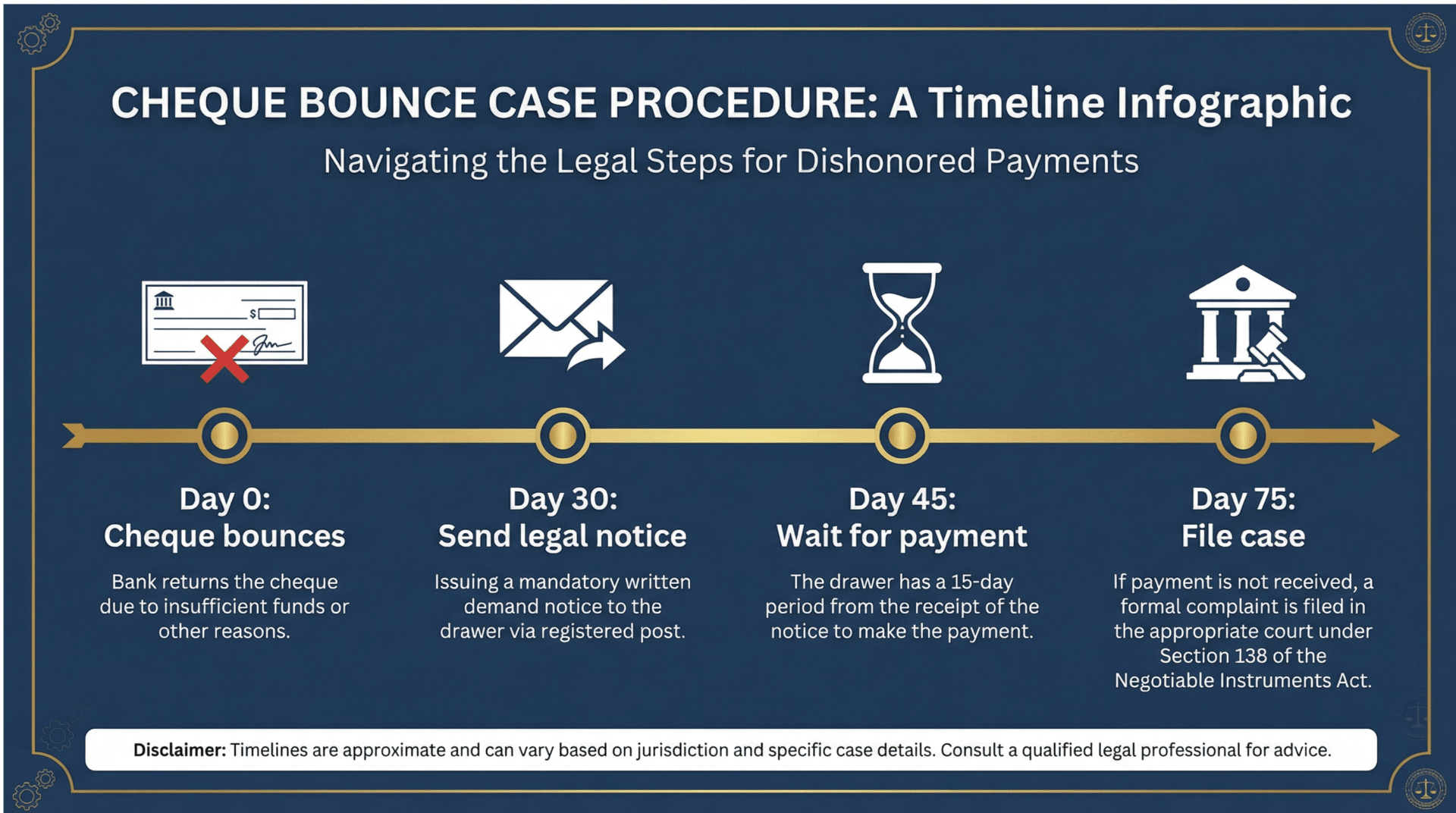 Understand the legal process, penalties, timelines, and defenses involved in cheque bounce cases under Section 138 of the Negotiable Instruments Act